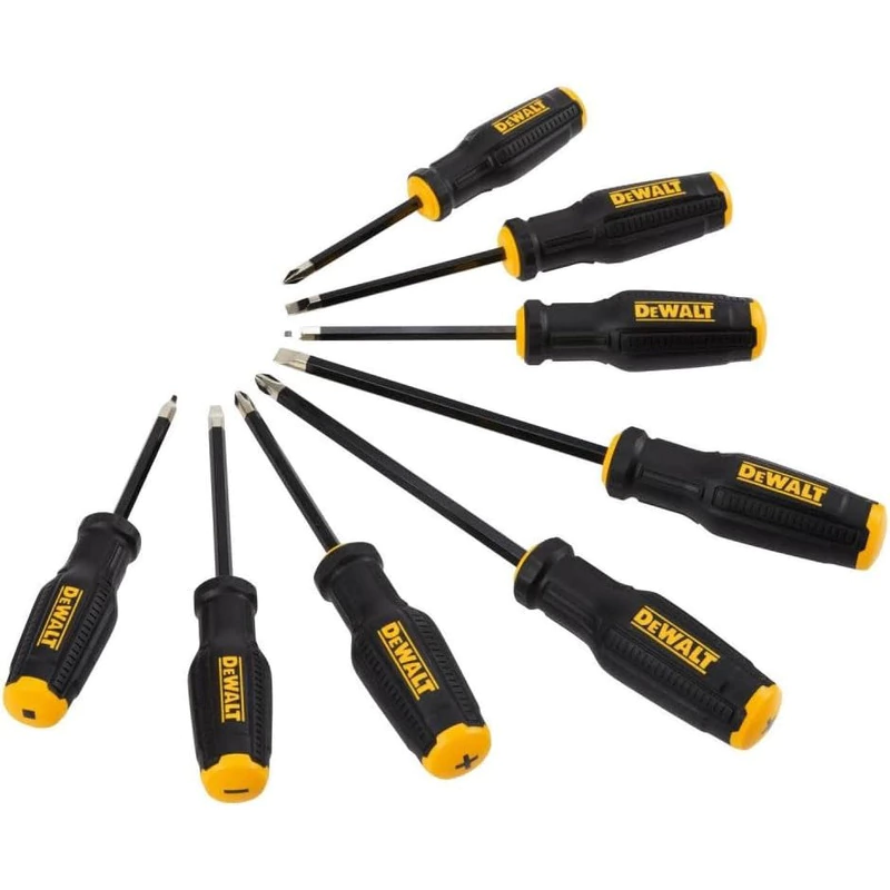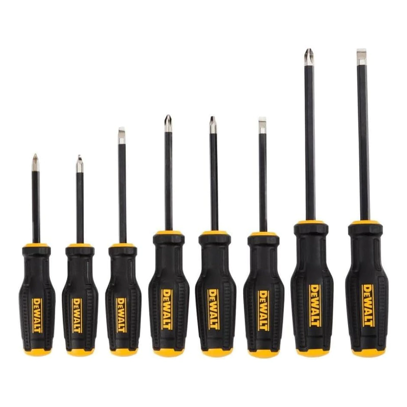 TOUGHSERIES™ 8 pc. Juego de destornilladores, diseñado para ofrecer una resistencia a la corrosión y al óxido 10 veces mayor*. Los destornilladores de barra de acero S2 ofrecen alta resistencia y resistencia a la flexión y cada uno cuenta con una punta recubierta de níquel y un acabado en cromo negro. Apriete y afloje los sujetadores con bajo deslizamiento y pelado mientras aprovecha un mejor contacto con los sujetadores gracias a las puntas MAX FIT® mecanizadas con precisión. Los destornilladores se fabricaron para ofrecer un par elevado y reducir la tensión en la mano gracias a su agarre suave y bimaterial.